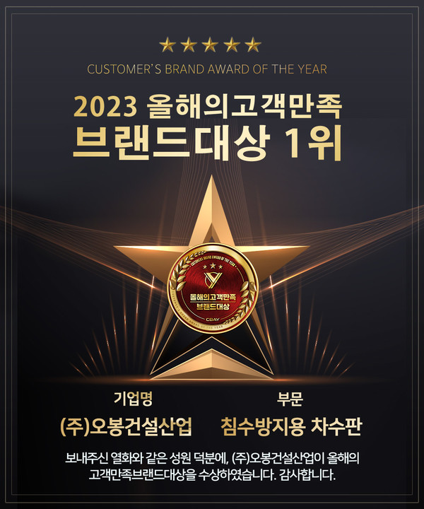 ‘㈜오봉건설산업(대표 이종욱)’이 지난 29일, 2023 올해의고객만족브랜드대상 ‘침수방지용차수판’ 부문에서 1위를 수상했다.